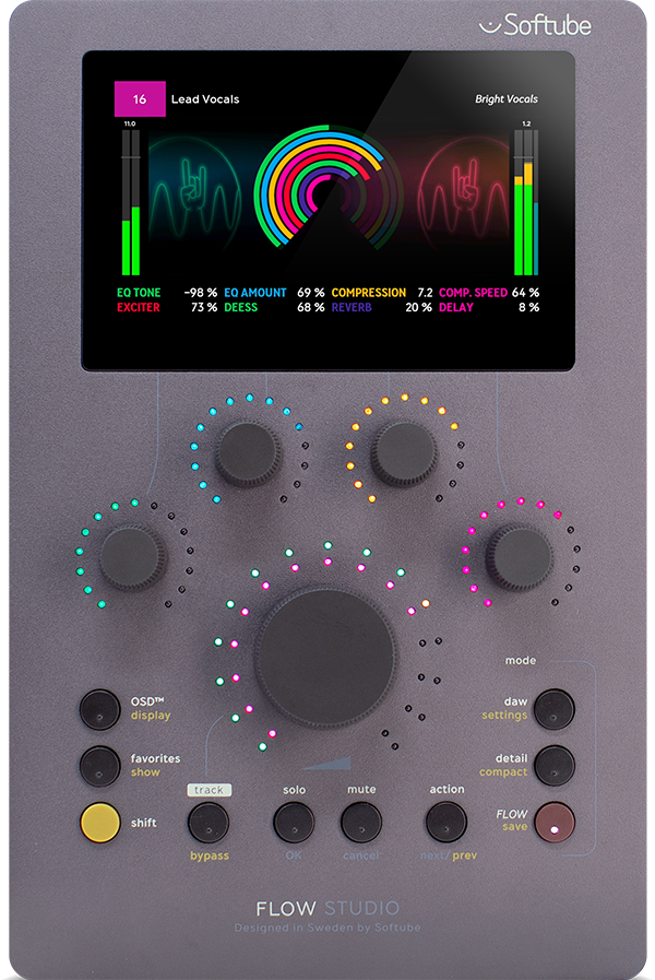 EQ curves, gain reduction, reverb tails, mic position, and metering. Flow® Studio’s 4.3-inch display is big for a reason: to give you the best possible set of visualizations to navigate your sound wherever you are in your process or what kind of effect you are controlling.